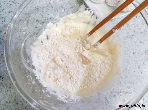 튀김옷이 두껍게 입혀지도록 되직하게 반죽했어요.