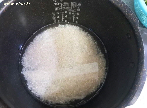 쌀 씻어 평소보다 사알짝 적게 물을 부었어요.
