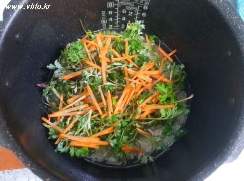 저는 워낙 여린 쑥이라 그냥 넣었고 당근도 조금 채 썰어 섞었어요.