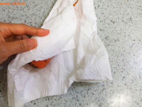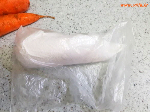 보송보송해진 당근은 만약 오래 두어야 한다면 주방 티슈에 하나씩 말아