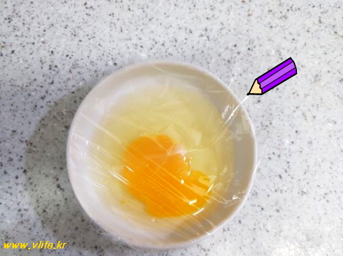 소금 몇 알 뿌리고 접시 덮거나 랩 씌우는데 한쪽은 바람길 만들어 줘야 달걀에 랩이 붙지 않아요.