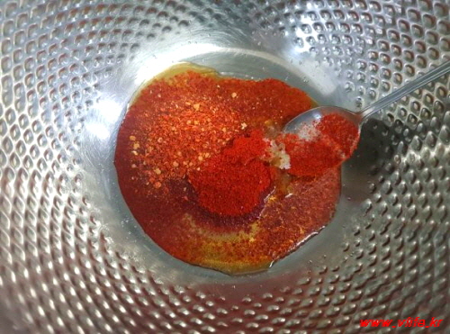 버무릴 양푼에 마늘, 고춧가루, 액젓 조금, 설탕 넣어 고루 섞어요.