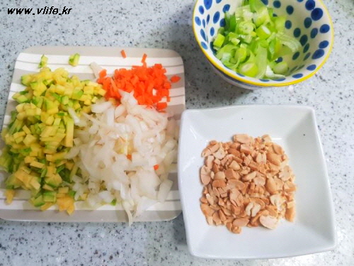 준비물; 밥, 땅콩, 호박, 당근, 양파, 파, 소금, 깨소금, 기름