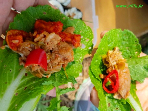 밭에 도착하자마자 생수로 대강 헹궈 고기 싸 먹었는데 얼마나 맛있던지....
