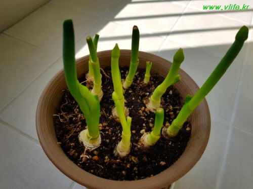 화분에 심어 놓은 파 뿌리가 자라 꽃이 피었지 뭐에요.