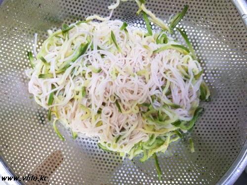 찬 물에 비벼 가며 헹궈 물기 빼요.