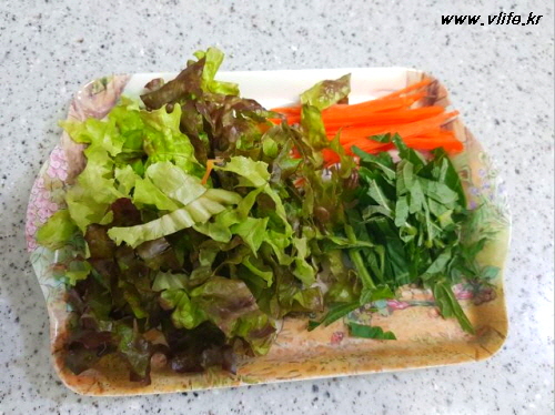 상추, 깻잎, 당근 채 썰었어요.
