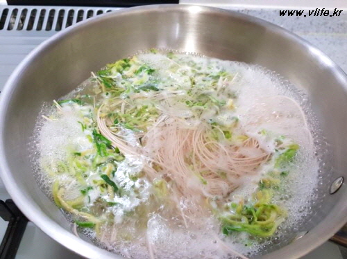 끓는 물에 무말랭이와 국수를 한 번에 넣고 끓어오를 때마다 찬 물 부어 탱탱하게 만들기를 두 번 정도 하고