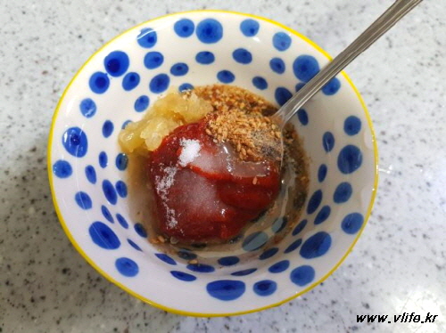 고추장, 설탕, 마늘, 깨소금, 후추, 식초, 매실액, 물엿 섞어 초고추장 만들어요.