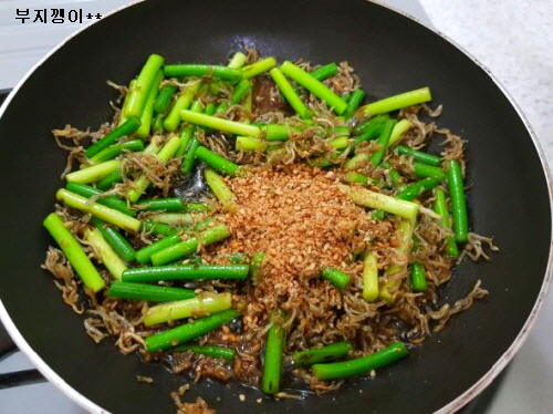 물+간장 넣고 조리듯 볶다가 깨소금 넣어 섞어 마무리