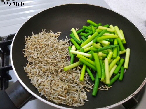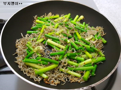 멸치에도 기름 조금 넣고 잠깐 볶다가 마늘쫑과 합해서 볶다가