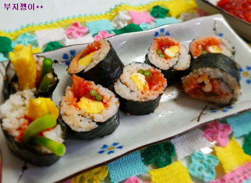 준비물; 밥, 오징어 젓갈, 김, 마늘쫑, 달걀, 참기름, 깨소금, 기름