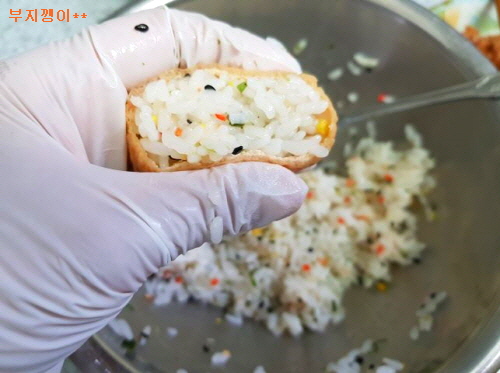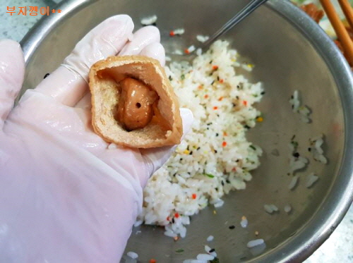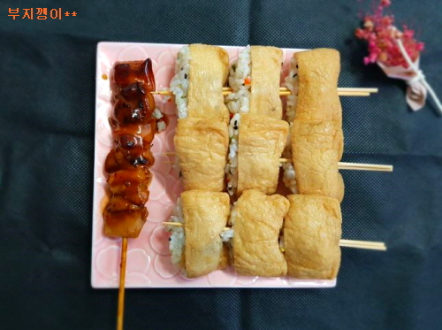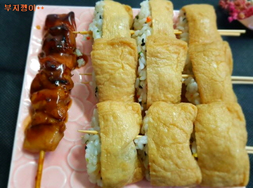 준비물; 유부 초밥 재료(꼭! 삼각형), 닭꼬치, 밥