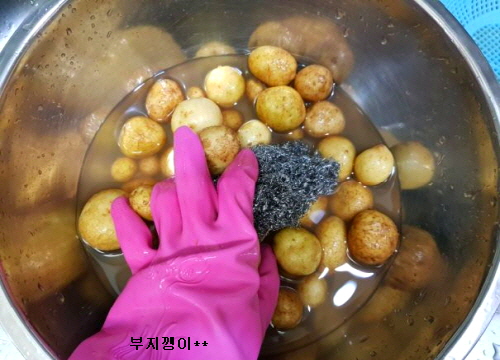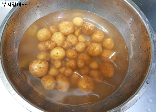 알감자를 10여분 쯤 물에 담가 두면 흙 등등이 불어 더 깨끗이 씻어져요.