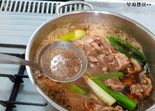 파 넣고 익도록 끓이면서 가끔씩 거품 걷어 냈어요.
