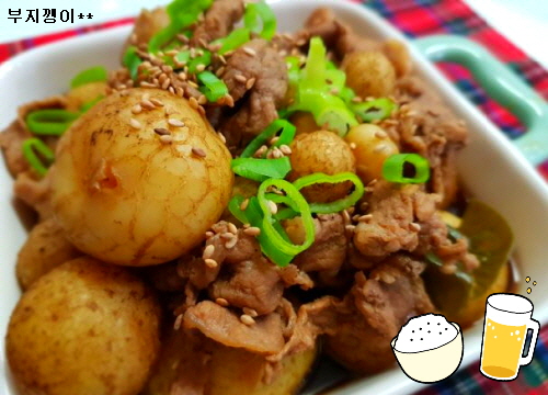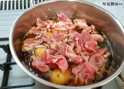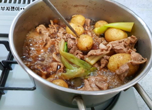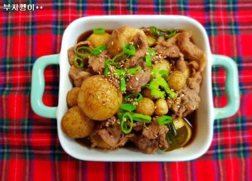 준비물; 알감자, 돼지고기 전지 불고기감, 파, 생강, 간장, 설탕, 후추