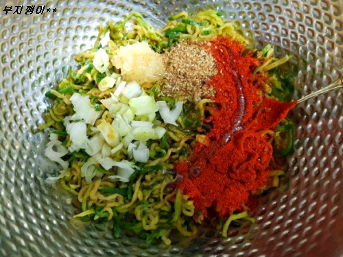 파, 마늘, 고춧가루, 물엿, 깨소금, 참기름에 간이 혹시 부족하면 소금이나 간장 조금 더 넣고 골고루 무쳐요.