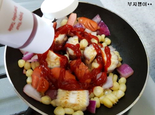 준비물; 옥수수, 소세지, 양파, 케첩, 설탕, 식용유