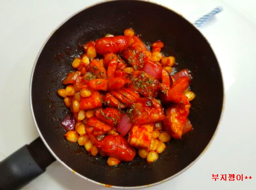 모양 좋고 양념 잘 배이라고 소시지에 칼집 넣었고 옥수수는 큼직하게 썰은 것과 알알이 뗀 것을 섞어 준비했어요.