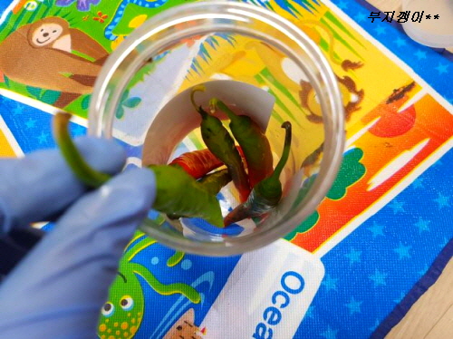 생 고추를 세워 넣을 수 있을 만한 통을 준비해서