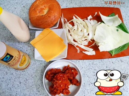 준비물; 베이글, (먹다 남은) 닭강정, 치즈, 양배추, 양파, 깻잎, 머스터드, 마요네즈