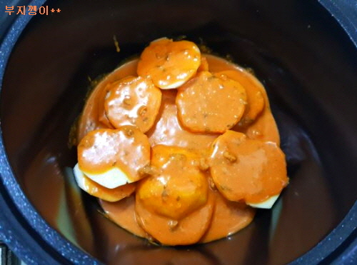 카레 물(?)과 감자를 번갈아 가며 냄비에 담고 약불에서 감자가 익도록 조렸어요.