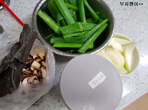 끓일 냄비나 양푼에 다시마, 건표고, 마늘, 멸치, 양파, 파, 마늘