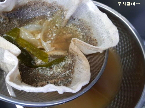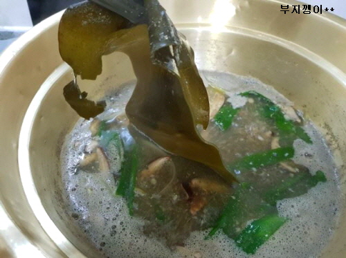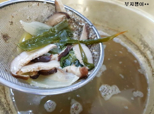 불 줄여 30여분 끓여 건더기 건져서 다시마와 표고는 따로 골라 두었어요.