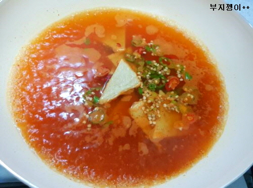 물에 고추장 조금 풀고, 어묵과 청양고추 넣고 끓이다가