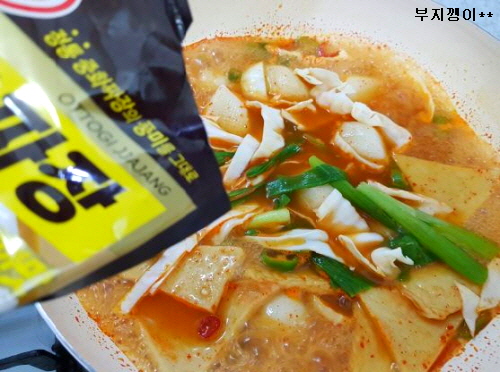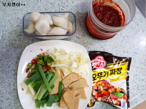 준비물; 송편, 어묵, 양배추, 파, 청양고추, 고추장, 짜장 가루, 라면수프
