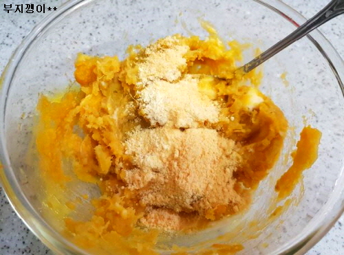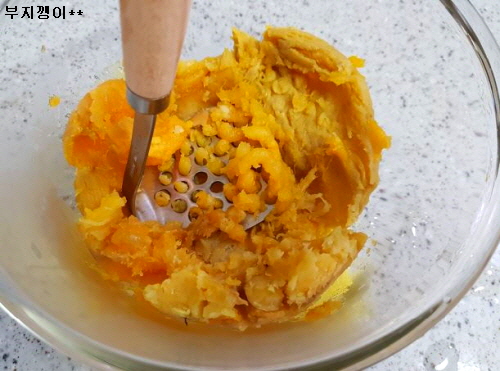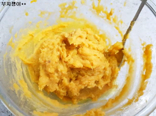 곱게 으깬 뒤 달달하게 설탕 넣어 섞고