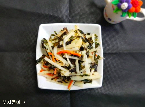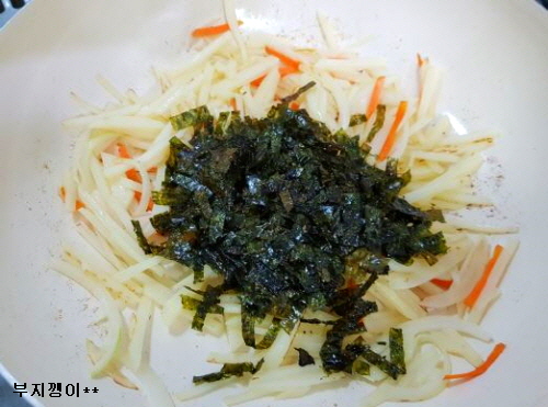 감자 볶음이 완성되면 접시에 담기 직전에 김가루 넣어 골고루 섞어요.