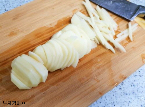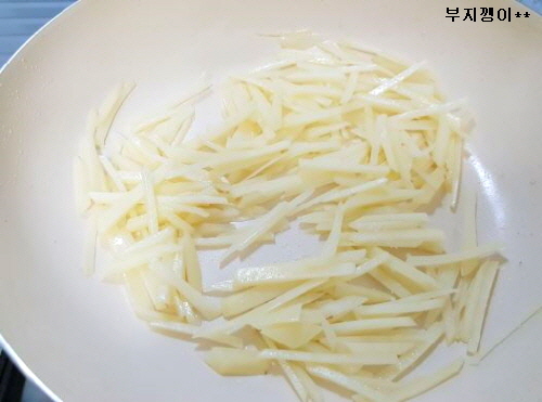 기름 두른 팬에 감자를 80%쯤 익도록 중간에 소금 넣어 볶다가