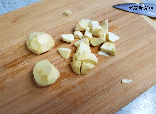 껍질 벗긴 생 밤은 먹기 좋은 크기로 큼직하게 썰었어요.