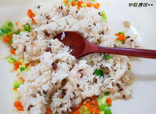 준비물; 밥, 밤, 호박, 양파, 당근, 파, 올리브유, 소금, 깨소금, 후춧가루, 참기름