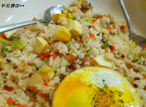 밥 넣고 상태 봐서 기름 보충해가며 볶으며 소금, 후춧가루 넣어 볶다가