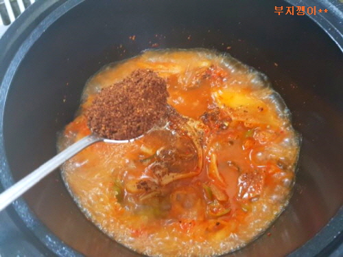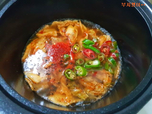 국물 붓고 고춧가루, 설탕, 후추, 청양고추 넣어 뚜껑 덮어 김치가 무르도록 폭폭 끓여요.