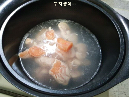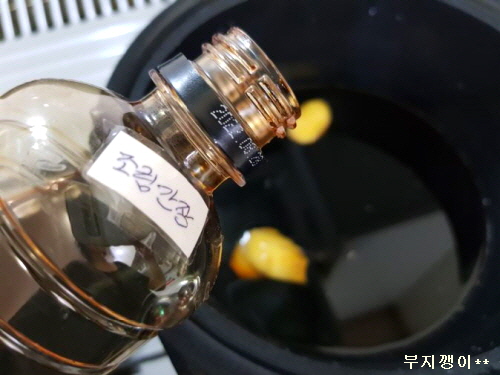 물과 간장(색 진하게 조림간장), 생강 넣고