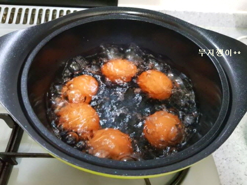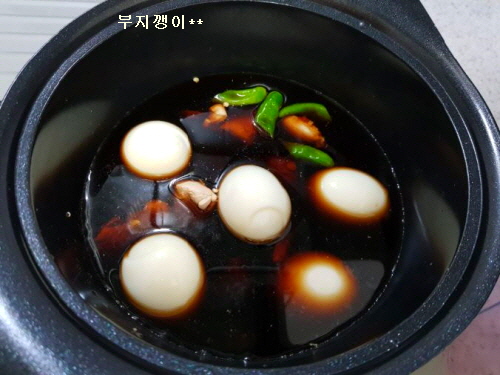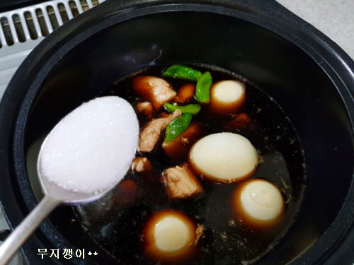 설탕 넣고 고기와 달걀에 맛 스미도록 가끔 저어가며 졸여요.