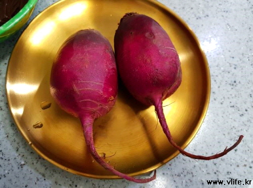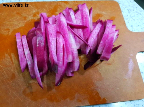 준비물; 말린 도토리묵, 빨간 무, 양념간장(간장+청양고추, 양파, 참기름, 깨소금, 고춧가루)