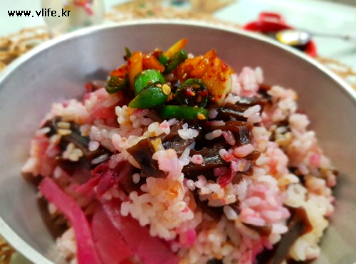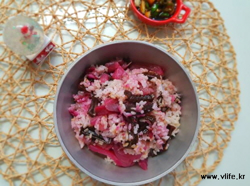 예쁜 빨간 무와 쫄깃한 말린 묵이 입맛을 확 살려줍니다.