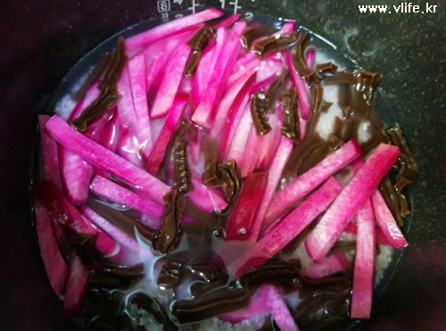 말린 도토리 묵과 빨간 무 넣고 '묵 무 밥'을 지었어요.