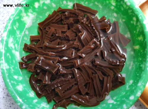 말린 묵을 미지근한 물에 담가 휘어질 만큼 불렸어요.