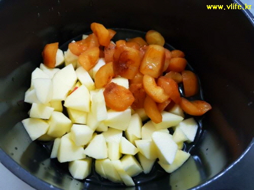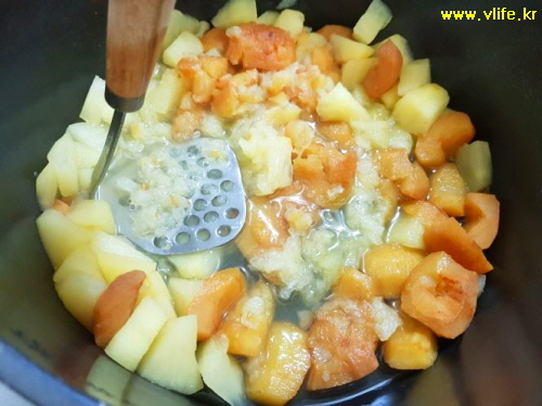 타지 않을 만큼 약간의 물과 함께 썰은 사과 넣어 무르도록 끓이다가