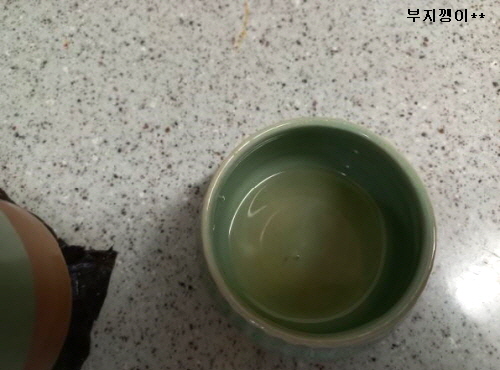찻잔에 고이는 물은 버렸어요. 혹시 콩에 닿으면 썩을 것 같아서요.