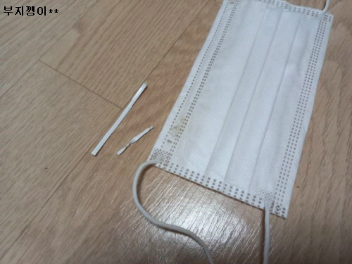남편 마스크 윗부분을 이(?)로 조금 물어뜯어 코에 거는 부분에 있는 철사를 조금 빼 마구 돌려서 끊고, 나머지는 다시 코에 걸쳐지는 부분까지 밀어 넣어 마스크가 흘러내리지 않게 했어요.