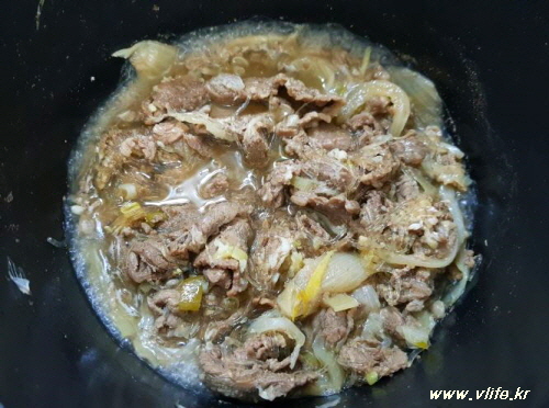 밥을 넓게 펴 올린 뒤 고기 국물 골고루 뿌리고