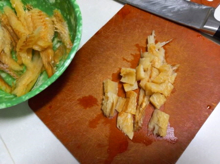 황태를 물에 잠깐 담갔다가 손톱만한 크기로 잘랐어요.