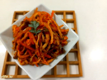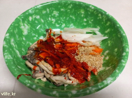 재료; 느타리 버섯, 초고추장(고추장+식초+설탕), 양파, 당근, 소금, 고춧가루, 깨소금