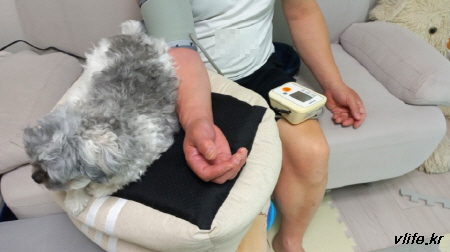 남편이 혈압 재면서 팔 높이를 맞추기 위해 그 방석을 무릎에 엎었어요.